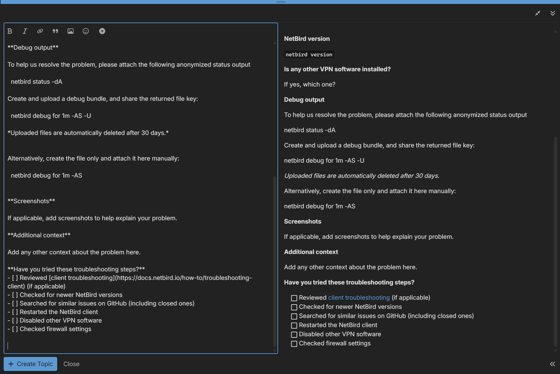 When you open the Community Support forum, you’ll get a template. This template is used for additional assistance with issues specificly regarding NetBird (nabbed from the GitHub issue form).