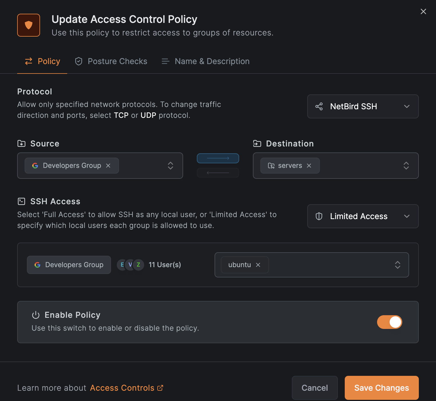 NetBird introduces fine-grained SSH access control with support for explicit local OS users on target machines.